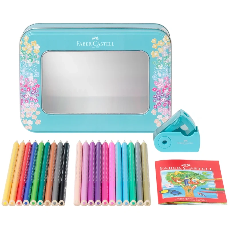 Набор состоит из 20 цветных карандашей и точилки. Прочная металлическая коробка удобна для хранения и транспортировки.