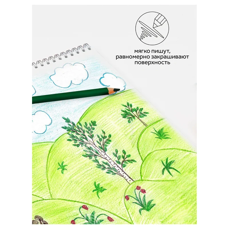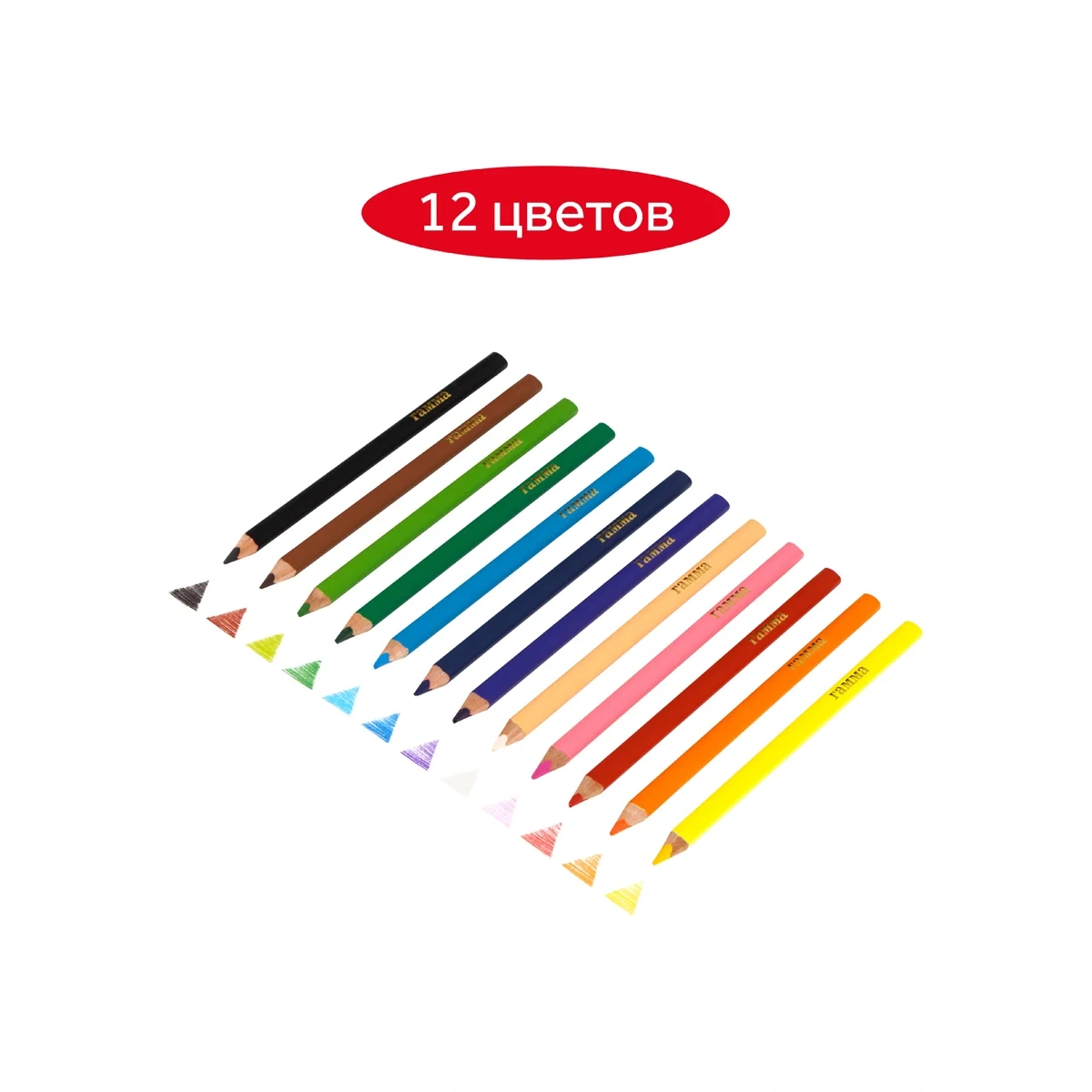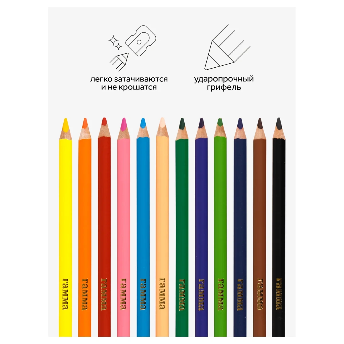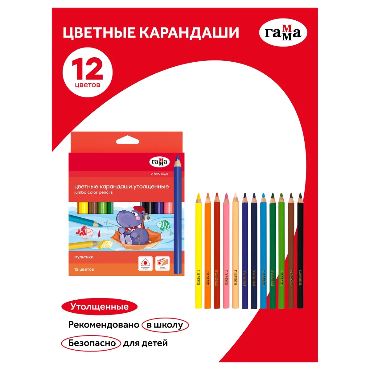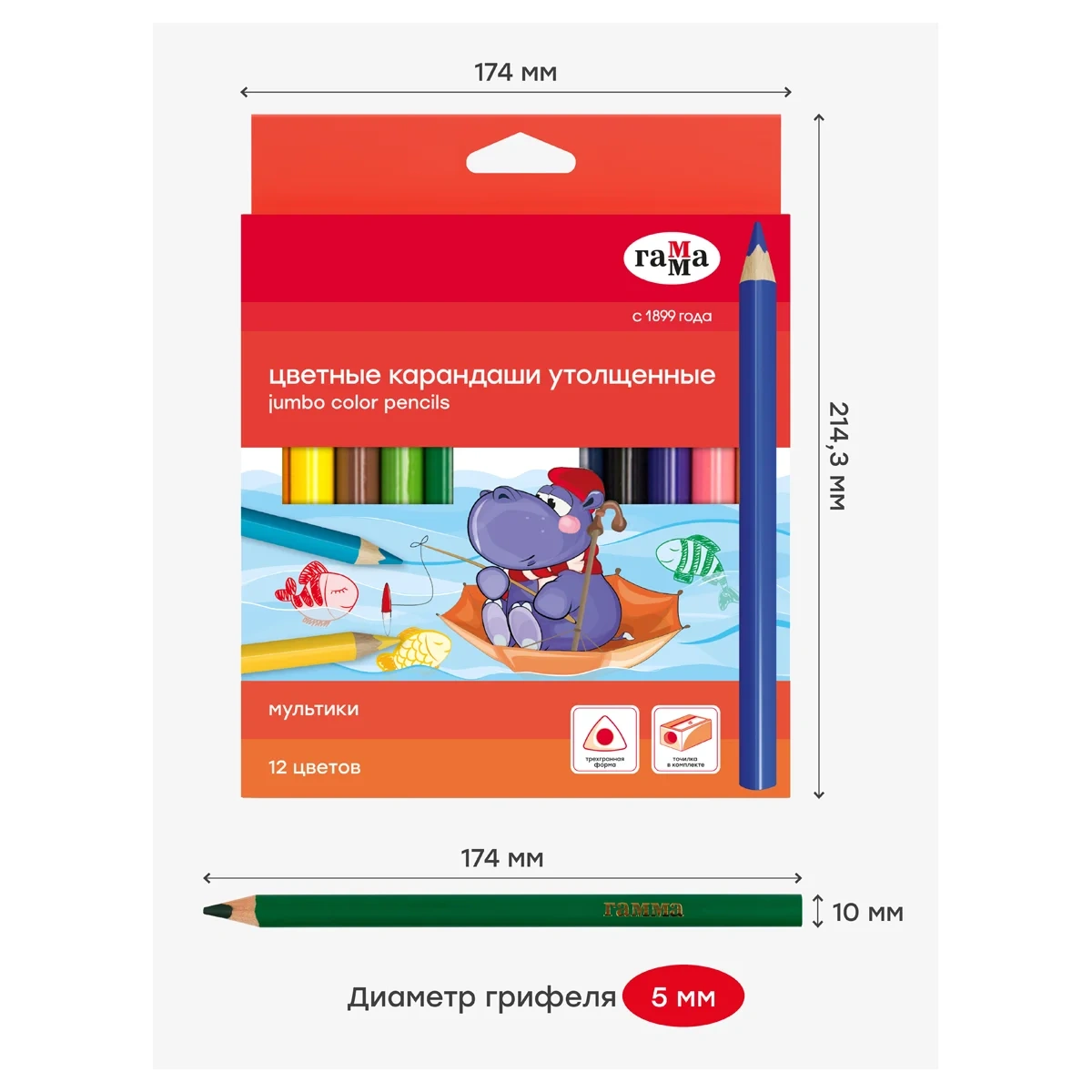 Утолщенные цветные карандаши ГАММА серии «Мультики» разработаны специально для начинающих юных художников. Карандаши выполнены в трехгранном корпусе из древесины, который удобно ложится в руку ребенка. В наборе 12 цветов: желтый, оранжевый, коричневый, телесный, черный, голубой, фиолетовый, синий, салатовый, зеленый, розовый, красный. Диаметр грифеля — 5 мм. Прочный грифель повышенной мягкости обеспечивает легкое скольжение и рисование на бумаге любого типа. Грифель не крошится во время заточки и не ломается даже после падения. Корпус карандаша диаметром 10 мм и длиной 174 мм изготовлен из дерева. За яркость и высокую укрывистость отвечают качественные пигменты в составе. Упаковка – картонная коробка с европодвесом. В комплекте есть точилка.