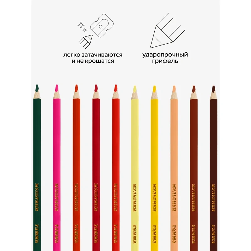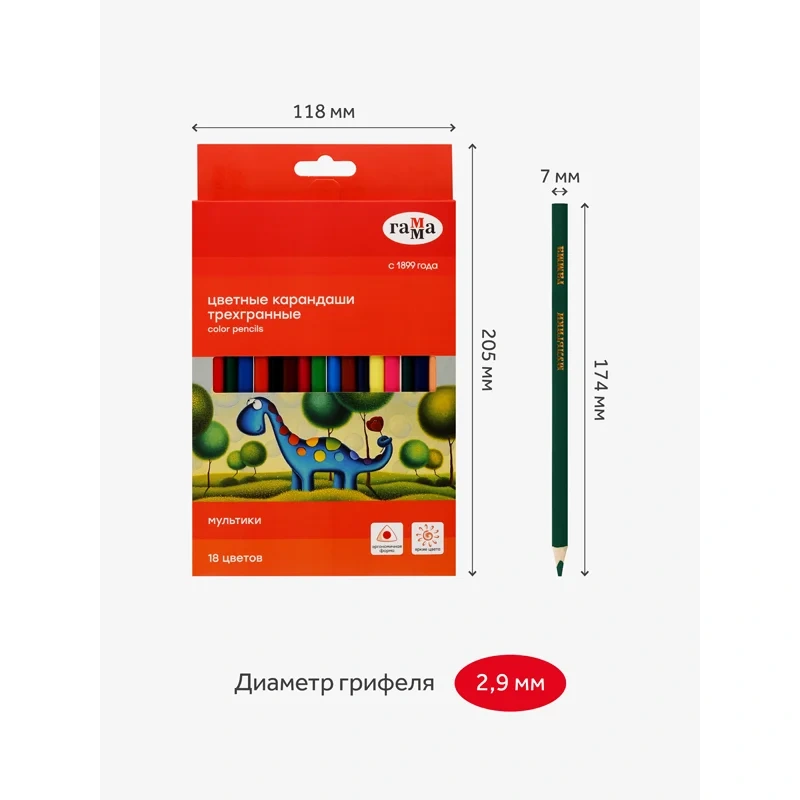 Цветные карандаши ГАММА серии «Мультики» выполнены в эргономичном трехгранном корпусе, который подскажет ребенку, как правильно держать инструмент во время творческих занятий. В наборе 18 цветов. Диаметр грифеля — 2,9 мм. Проклеенный ударопрочный грифель не крошится во время заточки и не ломается даже после падения. Корпус карандаша диаметром 7 мм и длиной 174 мм изготовлен из дерева. Специальная обработка древесины позволяет легко заточить карандаш без зазубрин и заноз. За яркость и высокую укрывистость отвечают качественные пигменты в составе. Ребенку не придется сильно давить на карандаш — рисунок получится ярким и равномерно закрашенным. Упаковка – картонная коробка с европодвесом.