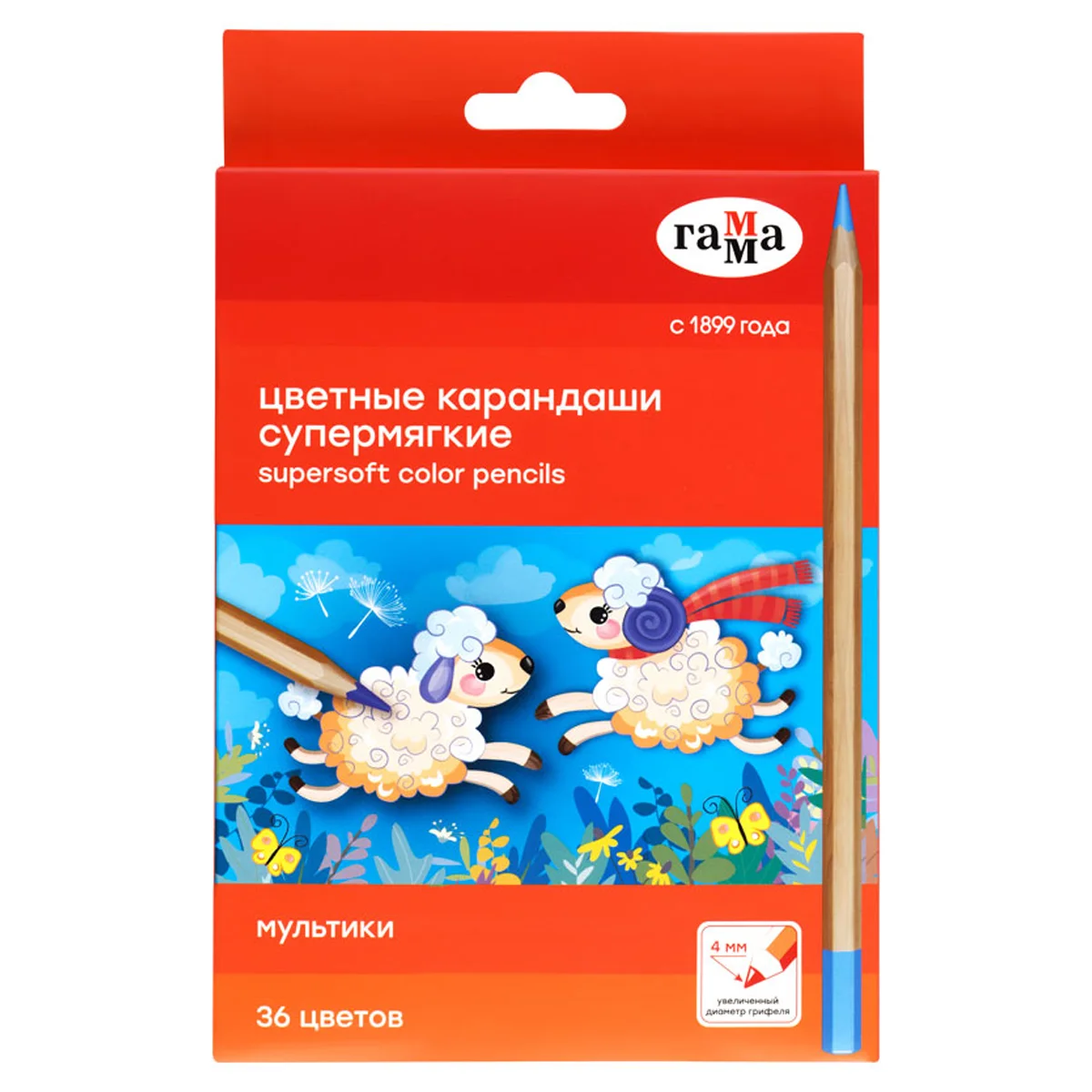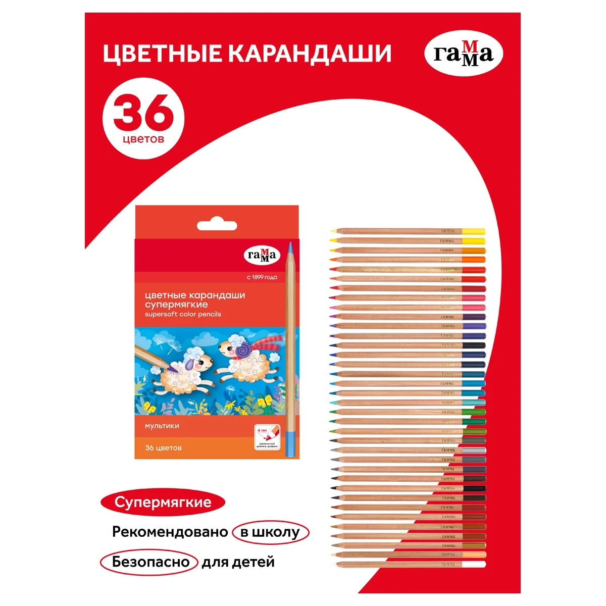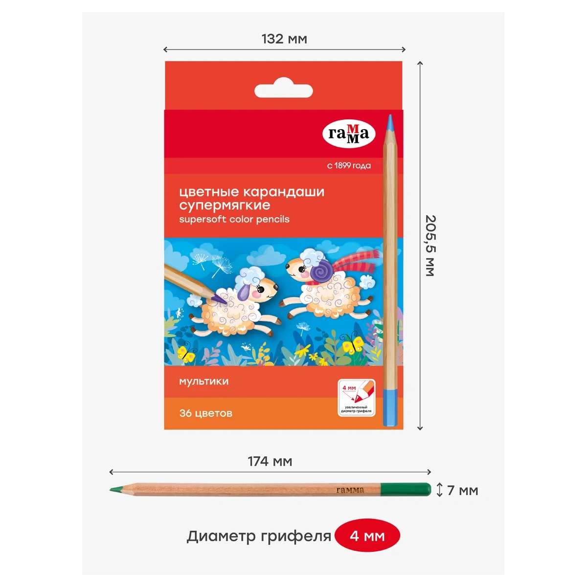 Супермягкие цветные карандаши ГАММА серии «Мультики» выполнены в шестигранном корпусе и благодаря грифелю премиум-качества отличаются легким скольжением и комфортным рисованием по бумаге любого типа. В наборе 36 цветов. Увеличенный диаметр грифеля — 4 мм способствует легкой штриховке изображения. Ребенку не придется сильно давить на карандаш — рисунок получится ярким и равномерно закрашенным. Проклеенный ударопрочный грифель не крошится во время заточки и не ломается даже после падения. Корпус карандаша диаметром 7 мм и длиной 174 мм изготовлен из дерева. Специальная обработка древесины позволяет легко заточить карандаш без зазубрин и заноз. Упаковка – картонная коробка с европодвесом.