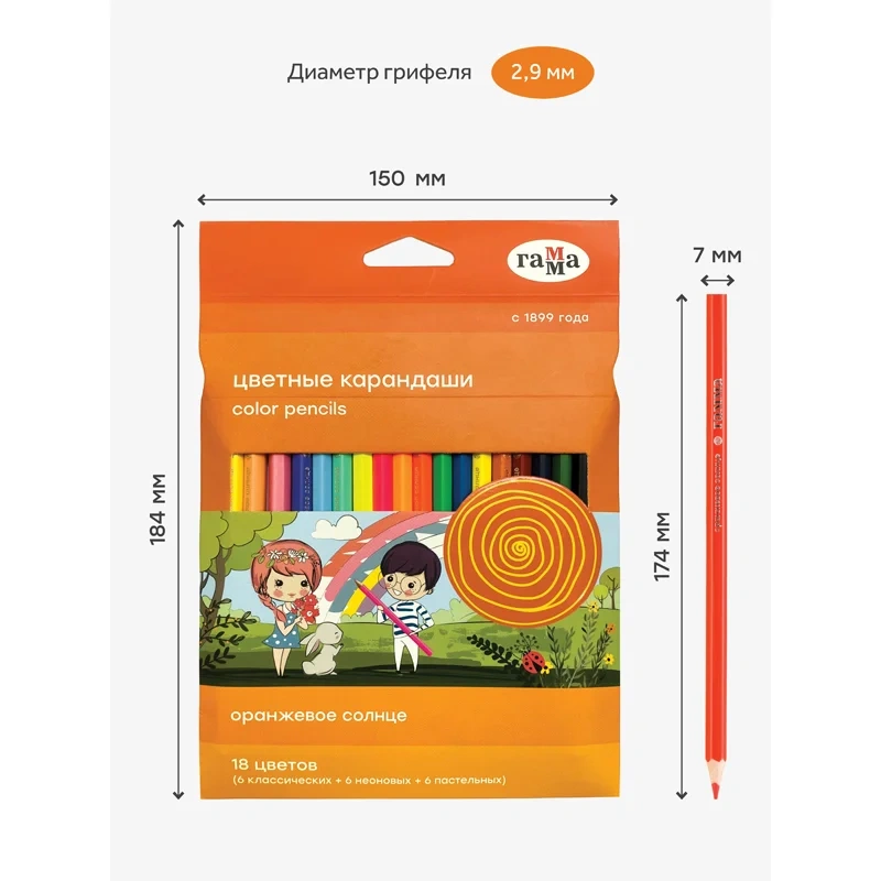 Карандаши цветные Гамма 'Оранжевое солнце', 18цв. (6 классич. + 6 неон. + 6 пастельн.), заточен., ка