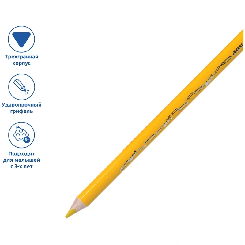 Специальные утолщенные трехгранные деревянные карандаши толщиной 10 мм, длиной 175 мм. Для самых маленьких детей, которые только учатся рисовать. Удобная треугольная форма корпуса эргономична, тренирует навык правильного захвата, снижает нагрузку на кисти рук, утолщенный грифель диаметром 5 мм проводит толстые и яркие линии. Рисуют на бумаге, ватмане, картоне. Палитра из двенадцати красивых чистых цветов (желтый, красный, телесный, зеленый, голубой, синий, фиолетовый, оранжевый, розовый, темно-зеленый, коричневый, черный). Грифель приклеен к деревянному корпусу, что предохраняет его от поломок при падении. Не содержат глютен и основные аллергенные компоненты.