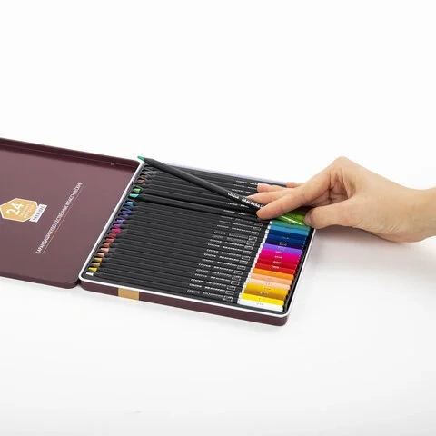 Набор состоит из 24 ярких цветов. Круглая форма сечения и матовый корпус позволяют удобно держать карандаши в руке. Древесина ценных пород и качество исполнения гарантируют легкую заточку. Благодаря высококачественному грифелю диаметром 4,0 мм рисунок ложится густой и четкой линией, обеспечивая бархатистую поверхность. Мягкий грифель дает мягкость нанесения и насыщенные цвета, позволяя легко смешивать различные оттенки. Все карандаши заточены и поставляются в металлическом пенале.