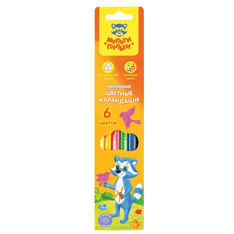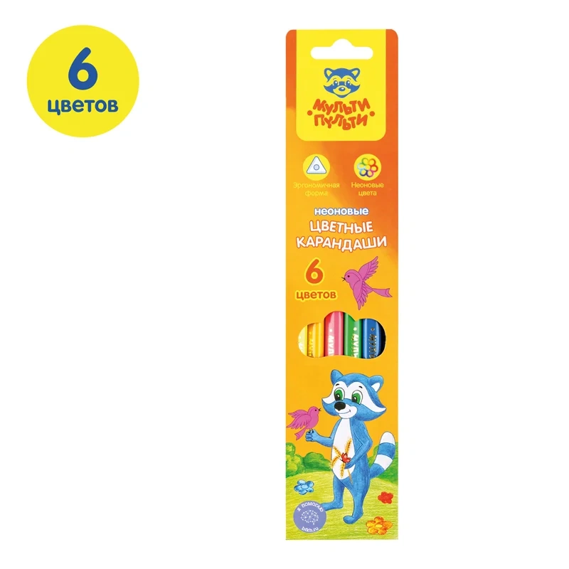 Карандаши цветные Мульти-Пульти 'Енот на лужайке', 06цв., трехгранные, неоновые, картон
