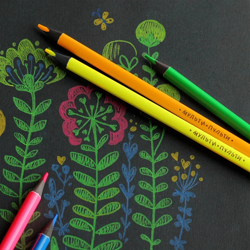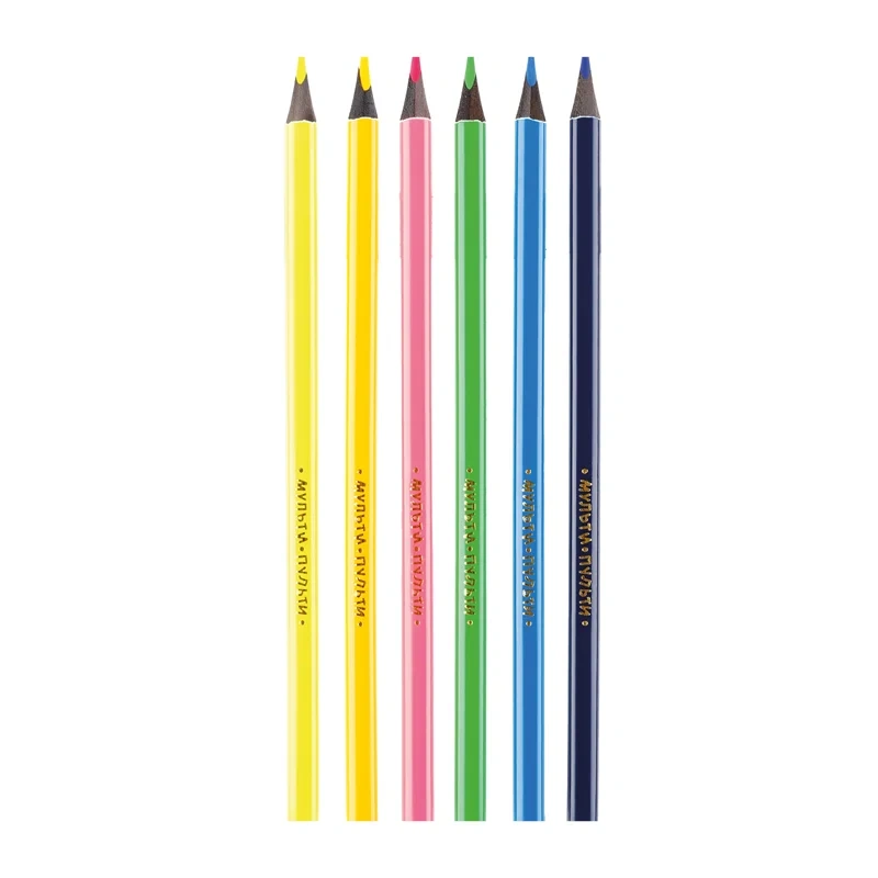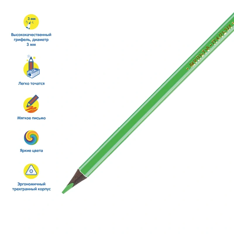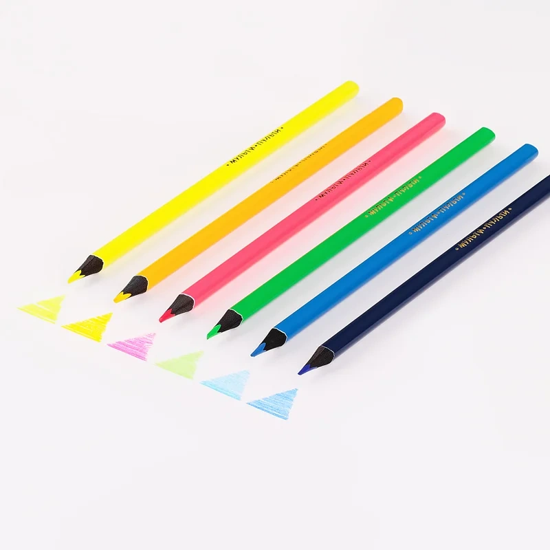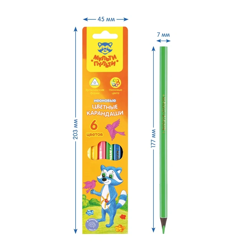 Карандаши цветные с заточенным грифелем, с эргономичной трехгранной формой корпуса. Яркие неоновые. Для лучшего эффекта рекомендуется использовать на черной бумаге. Мягкое письмо. Карандаши легко затачиваются. Упакованы в картонную лакированную коробку со склеенным европодвесом. Для детей старше 3-х лет.
