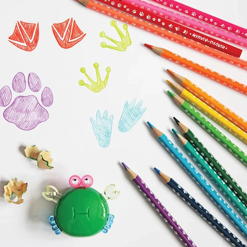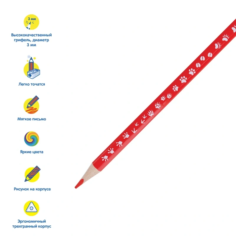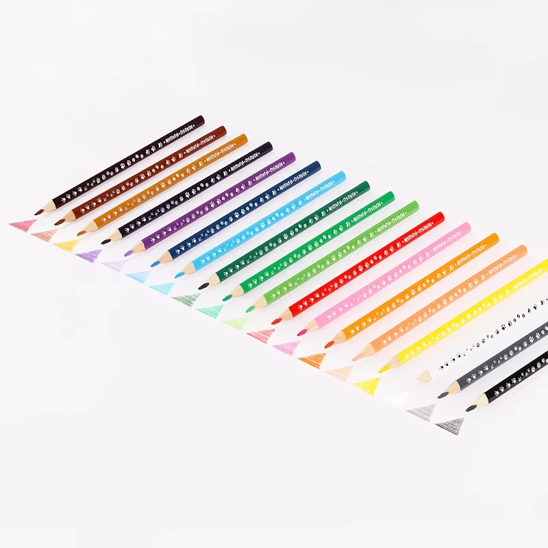 Карандаши цветные деревянные с заточенным грифелем. Трехгранный корпус с нанесенным рисунком. Мягкий яркий грифель диаметром 3мм. Грифель не ломается при падении. Яркие насыщенные цвета. Штрихи мягко ложатся на бумагу. Карандаши легко затачиваются. Упакованы в картонную коробку с европодвесом.