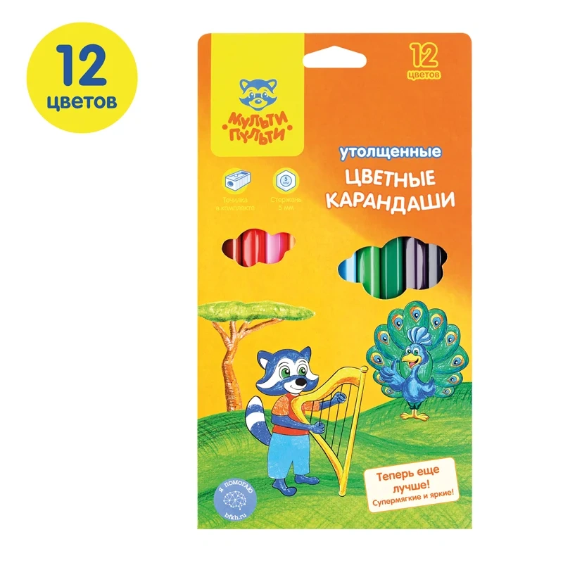 Карандаши цветные Мульти-Пульти 'Енот в саванне', 12цв., утолщ., заточен., картон, европ., с точилко