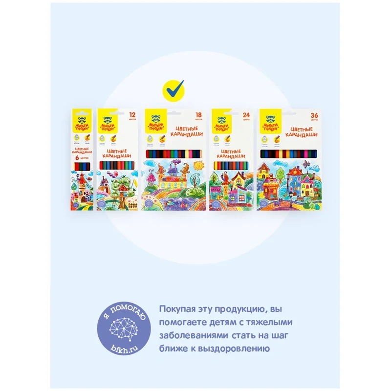В наборе 18 цветов, диаметр грифеля составляет 3 мм, что увеличивает срок службы карандаша. Карандаши упакованы в картонную коробку с глянцевой ламинацией и европодвесом. Товар предназначен для детей старше 3-х лет.