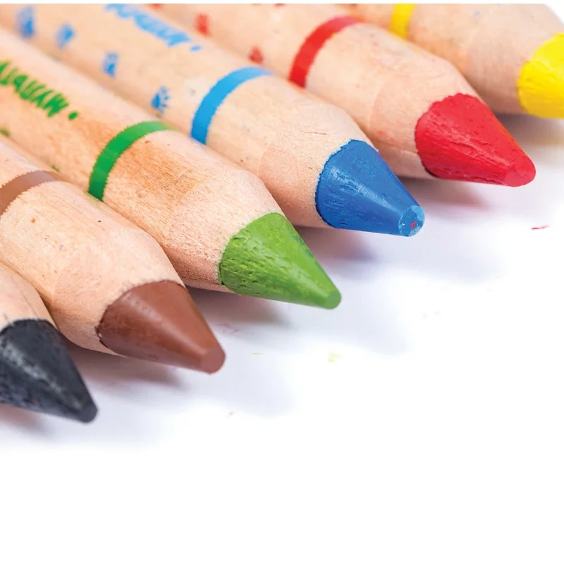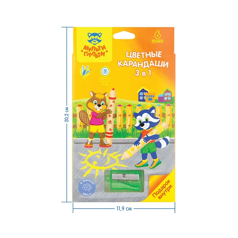 Карандаши цветные с заточенным грифелем. Суперутолщенный корпус, круглая форма.Грифель диаметром 10 мм. Яркие насыщенные цвета. Можно рисовать на разных поверхностях - бумаге, асфальте, стекле, металле. Обладают эффектом акварельных красок - нанесенный рисунок можно размыть влажной кистью. В коплекте специальная точилка для заточки.Упакованы в картонную лакированную коробку со склеенным европодвесом.