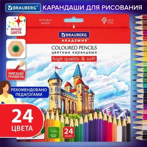 Карандаши цветные мягкие BRAUBERG АКАДЕМИЯ, 24 цвета, шестигранные, грифель 3 мм, 181866