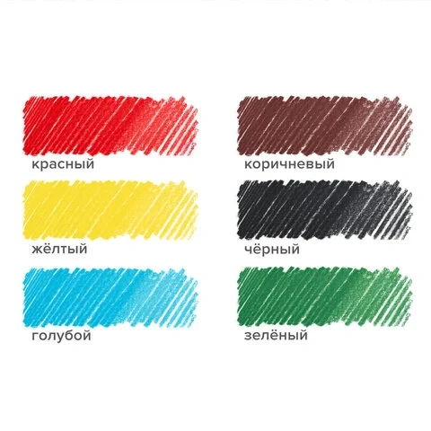 В наборе 6 цветов: красный, желтый, зелёный, голубой, коричневый, чёрный.