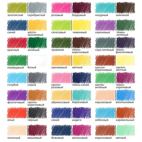В наборе 24 двусторонних карандаша и 48 цветов: черный, темно-синий, синий, голубой, салатовый, зеленый, темно-зеленый, болотный, серо-зеленый, желтый, оранжевый, темно-оранжевый, персиковый, фуксия, розовый, красный, темно-красный, бордовый, песочный, серый, светло-серый, фиолетовый, темно-коричневый, коричневый, светло-коралловый, земляной жёлтый, бледно-лазурный, оливковый, цвет морской волны, тускло-серый, чирково-голубой, зеленоватая умбра, папоротниково-зелёный, пастельно-сиреневый, сливовый, йельский синий, индийский желтый, бледно-розовый, светло-оливковый, лавандово-фиолетовый, жёлто-зелёный, пурпурный, жемчужно-розовый, изумрудный, жёлтый арилид, насыщенно-изумрудный, розовато-золотой, бледный хаки.