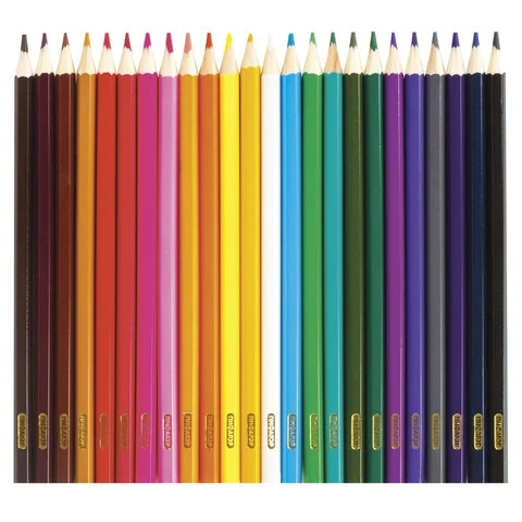 Набор состоит из 24 цветов: желтый, красный, алый, фуксия, розовый, оранжевый, белый, персиковый, канареечный, голубой, бирюзовый, салатовый, зеленый, темно-зеленый, пурпурный, фиолетовый, синий, темно-синий, светло-коричневый, каштановый, коричневый, темно-коричневый, серый, черный. Шестигранная форма сечения корпуса позволяет не скатываться карандашу с поверхности стола во время занятий рисованием. Они изготовлены из высокосортной белой древесины ценных пород и имеют лакированный корпус. Качество древесины и исполнения гарантируют легкую заточку. Грифель из натуральных материалов и пигментов диаметром 3 мм обладает повышенной прочностью. Все карандаши заточены и поставляются в картонной упаковке с европодвесом.