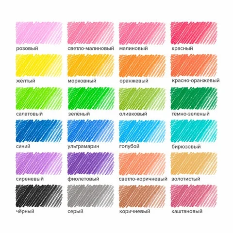 Набор состоит из 24 цветов: белый, каштановый, темно-коричневый, бежевый, малиновый, розовый, коричневый, коралловый, красный, персиковый, серый, оранжевый, канареечный, желтый, салатовый, светло-зеленый, бирюзовый, зеленый, темно-синий, темно-зеленый, синий, фиолетовый, сиреневый, черный. Шестигранная форма сечения корпуса позволяет не скатываться карандашу с поверхности стола во время занятий рисованием. Они изготовлены из высокосортной белой древесины ценных пород и имеют лакированный корпус. Качество древесины и исполнения гарантируют легкую заточку. Грифель из натуральных материалов и пигментов диаметром 3 мм обладает повышенной прочностью. Все карандаши заточены и поставляются в нескольких вариантах дизайна упаковки с европодвесом (без возможности выбора).