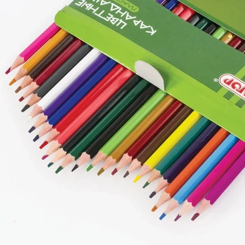 Набор состоит из 24 цветов: белый, каштановый, темно-коричневый, бежевый, малиновый, розовый, коричневый, коралловый, красный, персиковый, серый, оранжевый, канареечный, желтый, салатовый, светло-зеленый, бирюзовый, зеленый, темно-синий, темно-зеленый, синий, фиолетовый, сиреневый, черный. Шестигранная форма сечения корпуса позволяет карандашу не скатываться с поверхности стола во время занятий рисованием. Карандаши изготовлены из пластика и имеют лакированный корпус, который при разломе не образует острые края и безопасен для детей. Легко затачиваются. Грифель диаметром 2,65 мм обладает повышенной прочностью. Все карандаши заточены и поставляются в картонной упаковке с европодвесом.