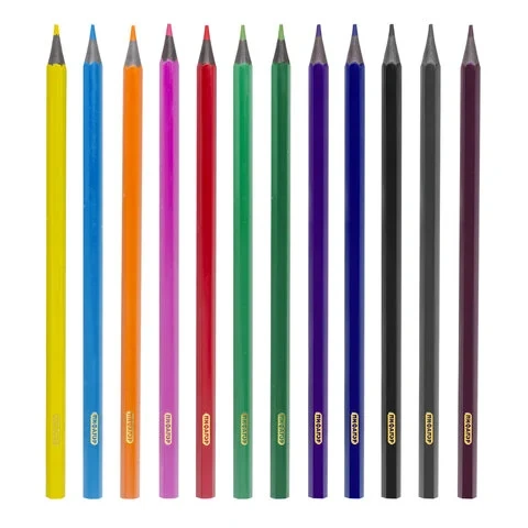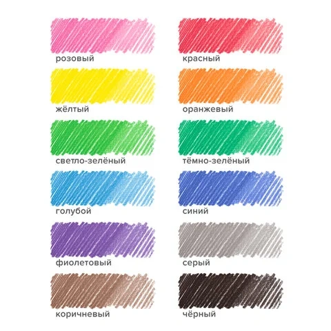 Набор состоит из 12 цветов: розовый, красный, желтый, оранжевый, салатовый, зеленый, голубой, синий, фиолетовый, коричневый, серый, черный. Шестигранная форма сечения корпуса позволяет карандашу не скатываться с поверхности стола во время занятий рисованием. Карандаши изготовлены из переработанного пластика и имеют лакированный корпус, который при разломе не образует острые края и безопасен для детей. Легко затачиваются. Грифель диаметром 3 мм обладает повышенной прочностью. Все карандаши заточены и поставляются в картонной упаковке с европодвесом.