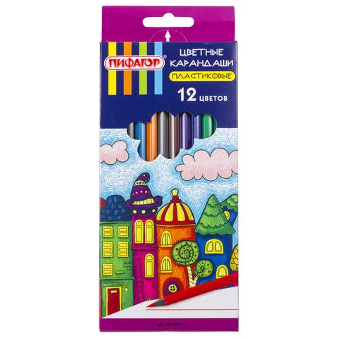 Карандаши цветные ПИФАГОР 'СКАЗОЧНЫЙ ГОРОД', 12 цветов, черный пластик, заточенные, 181583