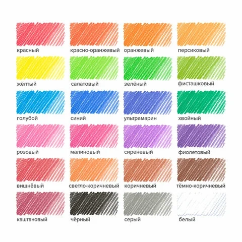 Набор состоит из 24 цветов: белый, бордовый, красный, алый, розовый, пурпурный, желтый, канареечный, оранжевый, салатовый, светло-зеленый, зеленый, темно-зеленый, голубой, синий, темно-синий, фиолетовый, темно-фиолетовый, светло-коричневый, коричневый, темно-коричневый, каштановый, серый, черный. Шестигранная форма сечения корпуса позволяет карандашу не скатываться с поверхности стола во время занятий рисованием. Карандаши изготовлены из пластика и имеют лакированный корпус, который при разломе не образует острые края и безопасен для детей. Легко затачиваются. Грифель диаметром 2,65 мм обладает повышенной прочностью. Все карандаши заточены и поставляются в картонной упаковке с европодвесом.