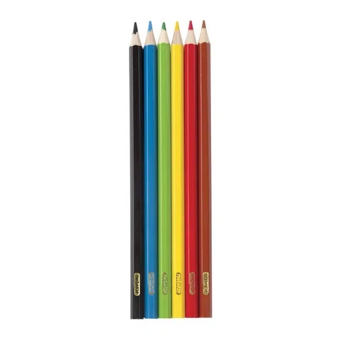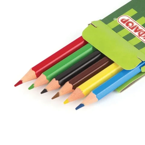 Набор состоит из 6 цветов: красный, желтый, зеленый, голубой, коричневый, черный. Шестигранная форма сечения корпуса позволяет карандашу не скатываться с поверхности стола во время занятий рисованием. Карандаши изготовлены из пластика и имеют лакированный корпус, который при разломе не образует острые края и безопасен для детей. Легко затачиваются. Грифель диаметром 2,65 мм обладает повышенной прочностью. Все карандаши заточены и поставляются в картонной упаковке с европодвесом.