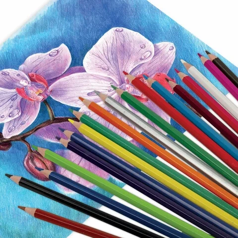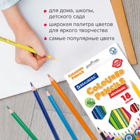 Набор состоит из 18 цветов: черный, темно-синий, синий, голубой, салатовый, зеленый, темно-зеленый, желтый, оранжевый, фуксия, розовый, красный, бордовый, серый, светло-серый, фиолетовый, темно-коричневый, коричневый. Шестигранная форма сечения корпуса позволяет не скатываться карандашу с поверхности стола во время занятий рисованием. Карандаши изготовлены из переработанного пластика и имеют лакированный корпус. Качество исполнения гарантирует легкую заточку. Грифель диаметром 3 мм обладает повышенной прочностью. Все карандаши заточены и поставляются в картонной упаковке с европодвесом.