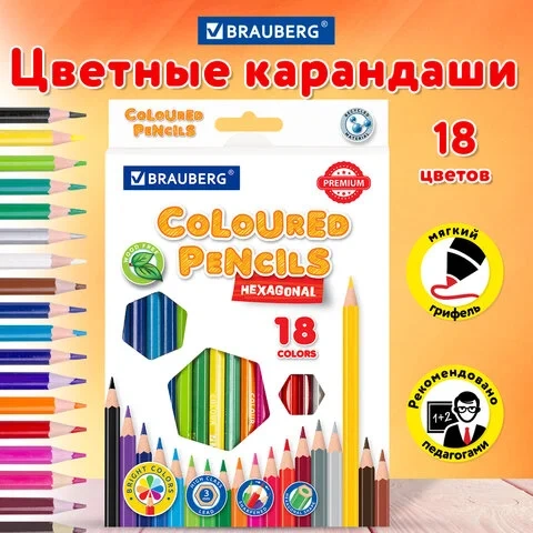 Карандаши цветные пластиковые BRAUBERG PREMIUM, 18 цветов, шестигранные, грифель мягкий 3 мм, 181667