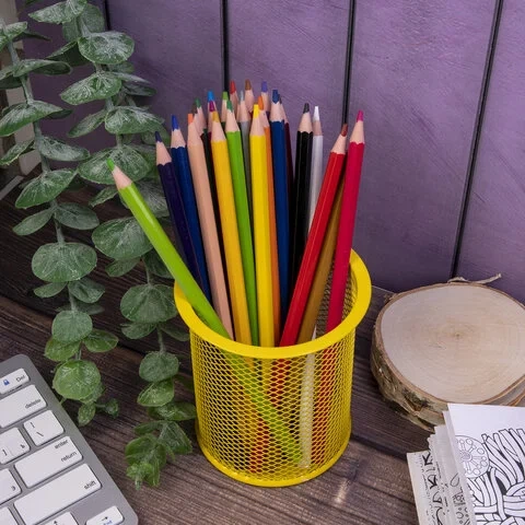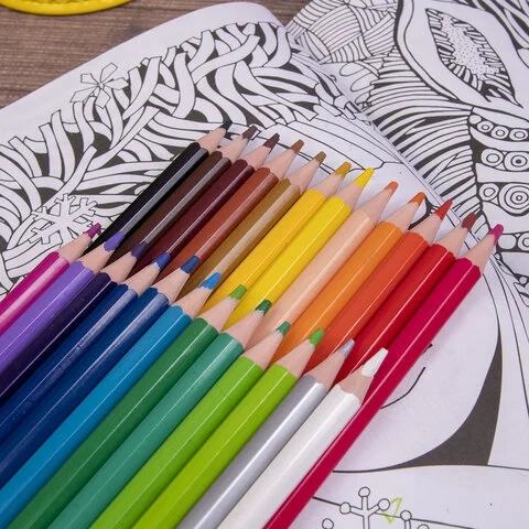 Набор состоит из 24 цветов: черный, темно-синий, синий, голубой, салатовый, зеленый, темно-зеленый, болотный, серо-зеленый, желтый, оранжевый, темно-оранжевый, персиковый, фуксия, розовый, красный, темно-красный, бордовый, песочный, серый, светло-серый, фиолетовый, темно-коричневый, коричневый. Шестигранная форма сечения корпуса позволяет не скатываться карандашу с поверхности стола во время занятий рисованием. Они изготовлены из переработанного пластика и имеют лакированный корпус. Качество исполнения гарантируют легкую заточку. Грифель диаметром 3 мм обладает повышенной прочностью. Все карандаши заточены и поставляются в картонной упаковке с европодвесом.