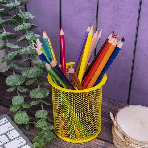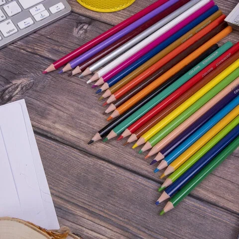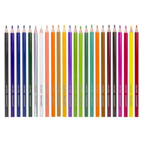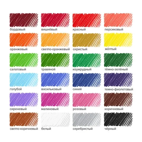 Набор состоит из 24 цветов: черный, темно-синий, синий, голубой, салатовый, зеленый, темно-зеленый, болотный, серо-зеленый, желтый, оранжевый, темно-оранжевый, персиковый, фуксия, розовый, красный, темно-красный, бордовый, песочный, серый, светло-серый, фиолетовый, темно-коричневый, коричневый. Трехгранная форма сечения корпуса позволяет не скатываться карандашу с поверхности стола во время занятий рисованием. Карандаши изготовлены из переработанного пластика и имеют лакированный корпус. Качество исполнения гарантирует легкую заточку. Грифель диаметром 3 мм обладает повышенной прочностью. Все карандаши заточены и поставляются в картонной упаковке с европодвесом.