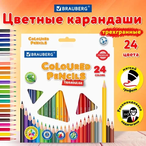Карандаши цветные пластиковые BRAUBERG PREMIUM, 24 цвета, трехгранные, грифель мягкий 3 мм, 181663