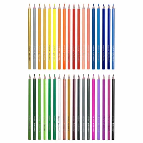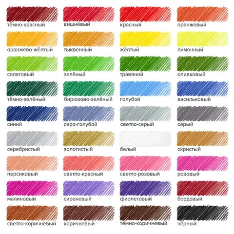 Набор состоит из 36 цветов: темно-синий, синий, фиолетовый, сиреневый, пурпурный, коралловый, розовый, бежевый, бледно-розовый, бордовый, красный, алый, темно-оранжевый, канареечный, оранжевый, желтый, бледно-желтый, белый, серебристый, золотистый, черный, серый, темно-зеленый, болотный, зеленый, бирюзовый, салатовый, бледно-зеленый, светло-серый, темно-коричневый, коричневый, каштановый, светло-коричневый, песочный, голубой, синий. Трехгранная форма сечения корпуса позволяет не скатываться карандашу с поверхности стола во время занятий рисованием. Они изготовлены из переработанного пластика и имеют лакированный корпус. Качество исполнения гарантируют легкую заточку. Грифель диаметром 3 мм обладает повышенной прочностью. Все карандаши заточены и поставляются в картонной упаковке с европодвесом.