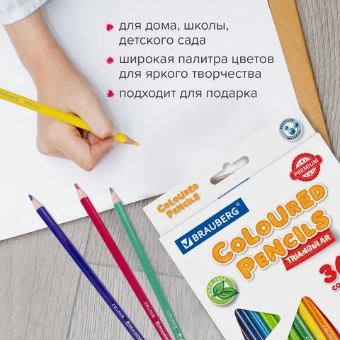 Карандаши цветные пластиковые BRAUBERG PREMIUM, 36 цветов, трехгранные, грифель мягкий 3 мм, 181664