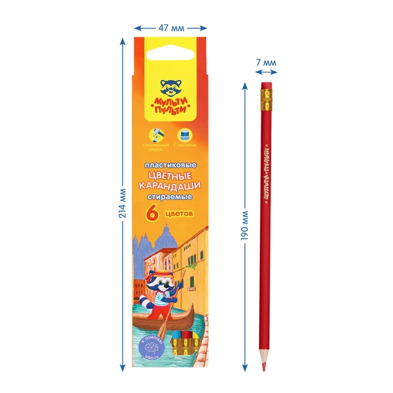 Карандаши цветные пластиковые с заточенным грифелем. Шестигранный корпус. Мягкий яркий грифель диаметром 3мм. Грифель не ломается при падении. Гибкий корпус. Ластик на каждом карандаше. Яркие насыщенные цвета. Штрихи мягко ложатся на бумагу. Карандаши легко затачиваются. Упакованы в картонную коробку с европодвесом.