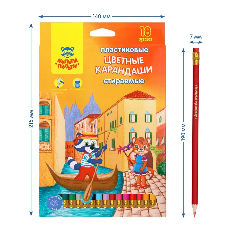 Карандаши цветные пластиковые стираемые Мульти-Пульти 'Енот в Венеции', 18цв., с ласт., заточ., карт
