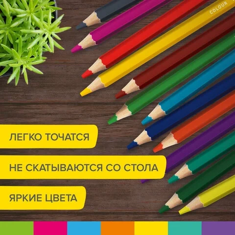 Набор состоит из 12 цветов: черный, синий, голубой, салатовый, зеленый, желтый, оранжевый, розовый, красный, серый, фиолетовый, коричневый. Шестигранная форма сечения корпуса позволяет не скатываться карандашу с поверхности стола во время занятий рисованием. Карандаши изготовлены из древесины ценных пород и имеют лакированный корпус. Высокосортная древесина и качество исполнения гарантируют легкую заточку. Грифель диаметром 5 мм обладает повышенной прочностью. Все карандаши заточены и поставляются в картонной упаковке с европодвесом.