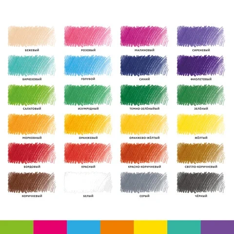 Набор состоит из 24 цветов: черный, темно-синий, синий, голубой, салатовый, зеленый, темно-зеленый, болотный, серо-зеленый, желтый, оранжевый, темно-оранжевый, персиковый, фуксия, розовый, красный, темно-красный, бордовый, песочный, серый, светло-серый, фиолетовый, темно-коричневый, коричневый.