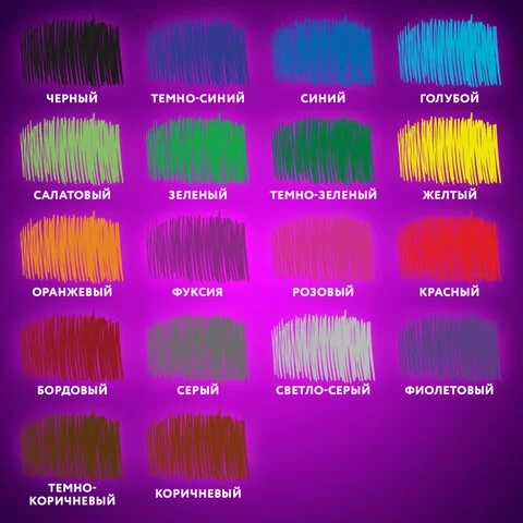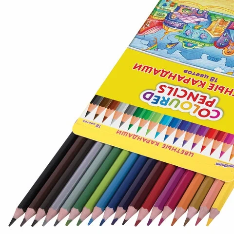 Набор состоит из 18 цветов: черный, темно-синий, синий, голубой, салатовый, зеленый, темно-зеленый, желтый, оранжевый, фуксия, розовый, красный, бордовый, серый, светло-серый, фиолетовый, темно-коричневый, коричневый. Шестигранная форма сечения корпуса позволяет не скатываться карандашу с поверхности стола во время занятий рисованием. Карандаши изготовлены из высококачественного пластика и имеют лакированный корпус. Качество исполнения гарантирует легкую заточку. Грифель диаметром 3 мм обладает повышенной прочностью. Все карандаши заточены и поставляются в картонной упаковке с европодвесом.