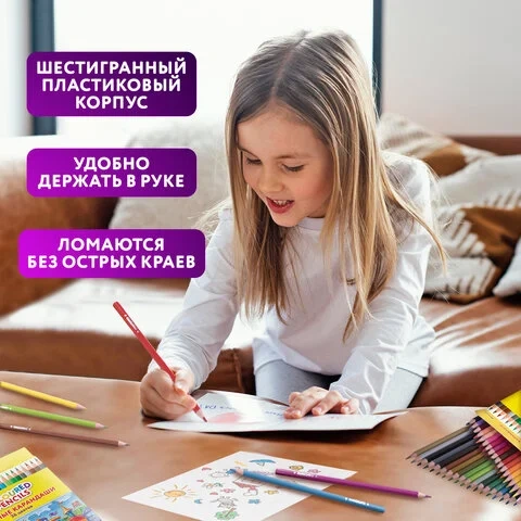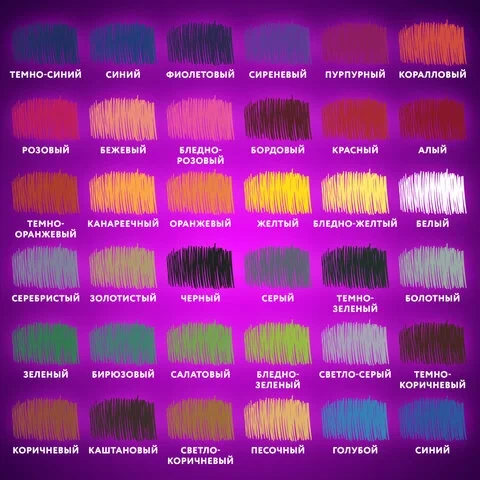 Набор состоит из 36 цветов: темно-синий, синий, фиолетовый, сиреневый, пурпурный, коралловый, розовый, бежевый, бледно-розовый, бордовый, красный, алый, темно-оранжевый, канареечный, оранжевый, желтый, бледно-желтый, белый, серебристый, золотистый, черный, серый, темно-зеленый, болотный, зеленый, бирюзовый, салатовый, бледно-зеленый, светло-серый, темно-коричневый, коричневый, каштановый, светло-коричневый, песочный, голубой, синий. Шестигранная форма сечения корпуса позволяет не скатываться карандашу с поверхности стола во время занятий рисованием. Они изготовлены из высококачественного пластика и имеют лакированный корпус. Качество исполнения гарантирует легкую заточку. Грифель диаметром 3 мм обладает повышенной прочностью. Все карандаши заточены и поставляются в картонной упаковке с европодвесом.