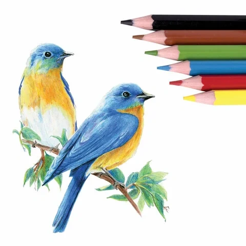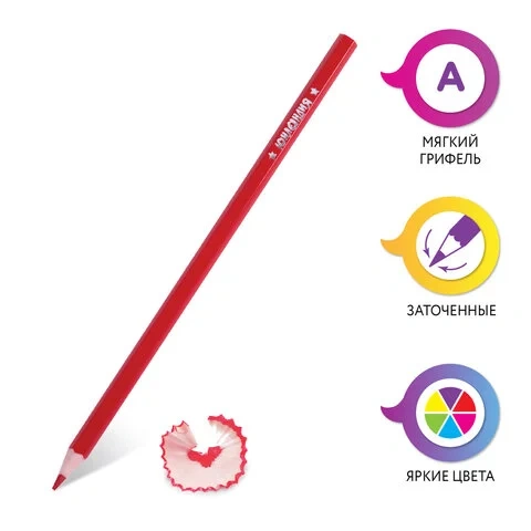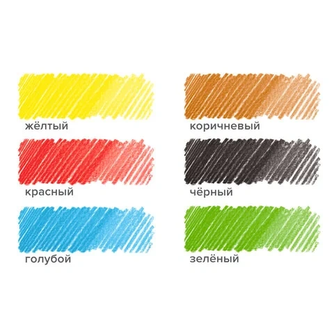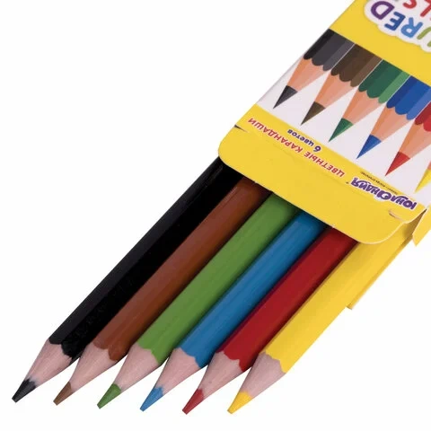 Набор состоит из 6 цветов: красный, желтый, зеленый, голубой, коричневый, черный. Шестигранная форма сечения корпуса позволяет не скатываться карандашу с поверхности стола во время занятий рисованием. Они изготовлены из высококачественного пластика и имеют лакированный корпус. Качество исполнения гарантирует легкую заточку. Грифель диаметром 3 мм обладает повышенной прочностью. Все карандаши заточены и поставляются в картонной упаковке с европодвесом.