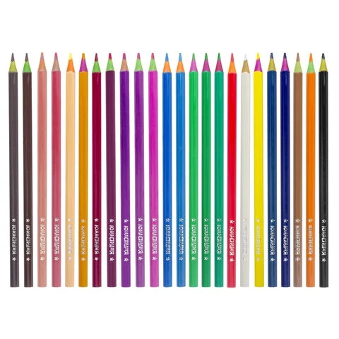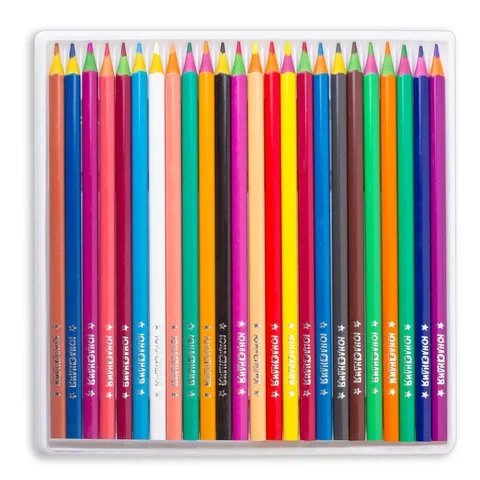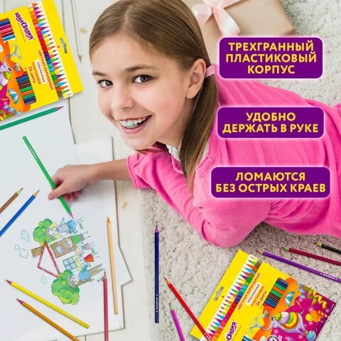 Набор состоит из 24 цветов: белый, каштановый, темно-коричневый, бежевый, малиновый, розовый, коричневый, коралловый, красный, персиковый, серый, оранжевый, канареечный, желтый, салатовый, светло-зеленый, бирюзовый, зеленый, темно-синий, темно-зеленый, синий, фиолетовый, сиреневый, черный. Яркие цвета развивают цветовосприятие ребенка. Трехгранная форма сечения корпуса позволяет не скатываться карандашу с поверхности стола во время занятий рисованием. Они изготовлены из необычного пластика разных цветов и имеют лакированный корпус. Качество пластика гарантирует легкую заточку. Мягкий грифель с диаметром 3 мм обладает повышенной прочностью, не ломается и не крошится при заточке. Все карандаши заточены и поставляются в картонной упаковке с европодвесом.