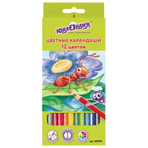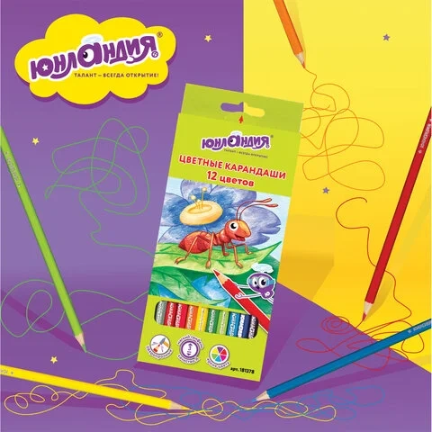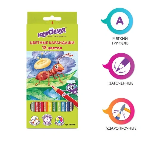 Карандаши цветные ЮНЛАНДИЯ 'В ГОСТЯХ У БУКАШЕК', 12 цветов, классические заточенные, 181378