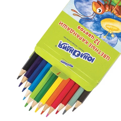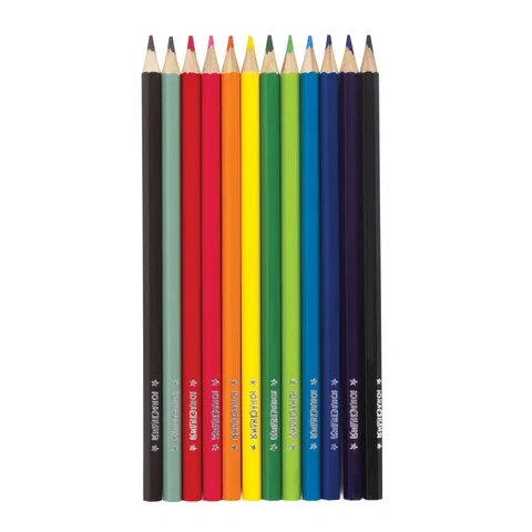 Набор состоит из 12 цветов: розовый, красный, желтый, оранжевый, салатовый, зеленый, голубой, синий, фиолетовый, коричневый, серый, черный. Яркие цвета развивают цветовосприятие ребенка. Шестигранная форма сечения корпуса позволяет не скатываться карандашу с поверхности стола во время занятий рисованием. Они изготовлены из древесины ценных пород и имеют лакированный корпус. Высокосортная древесина и качество исполнения гарантируют легкую заточку. Мягкий грифель качества 'А' с диаметром 3 мм обладает повышенной прочностью, не ломается и не крошится при заточке. Все карандаши заточены и поставляются в картонной упаковке с европодвесом.