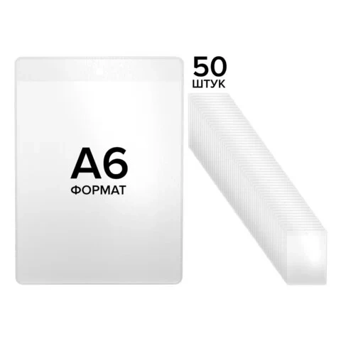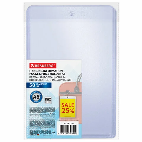 Карман имеет круглое отверстие для подвешивания ценника при помощи нейлоновых хомутов или веревочных биркодержателей. Предусматривает двустороннее размещение с верхней стороны. Формат – А6. Материал изготовления – мягкий ПВХ. Размер одного кармана – 11,1х16х0,1 см. Единица продажи – 50 шт., упакованы в пакет с липким краем.