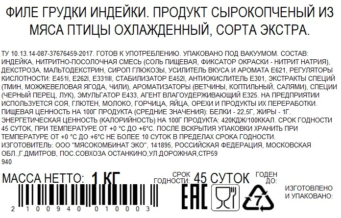 | Вид мяса | индейка |