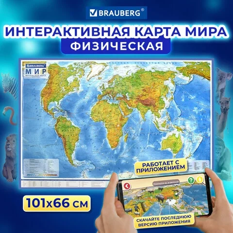 Карта мира физическая 101х66 см, 1:29М, с ламинацией, интерактивная, в тубусе, BRAUBERG, 112378