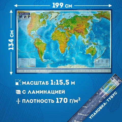 Карта мира физическая 199х134 см, 1:15,5М, с ламинацией, интерактивная, в тубусе, BRAUBERG, 112389