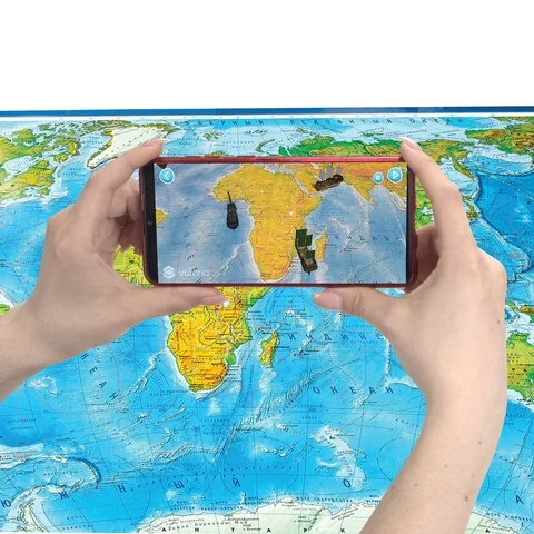 Скачайте приложение IQ Globen на IOS или Android, в главном меню выберите 'Карты', откройте карту мира и наведите камеру на один из материков. Эффект дополненной реальности не заставит себя ждать. Персонажи из приложения помогут в изучении мира.
