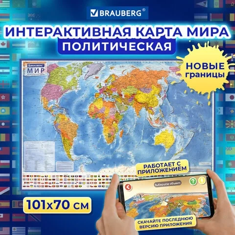 Карта мира политическая 101х70 см, 1:32М, с ламинацией, интерактивная, европодвес, BRAUBERG, 112381