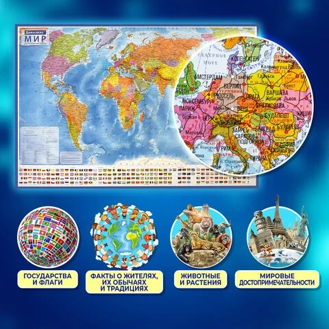 Настенная карта мира с масштабом 1:32 000 000 обладает размером 101х70 см. Выполнена из ламинированной бумаги плотностью 170 г/м2. Поставляется в тубусе.