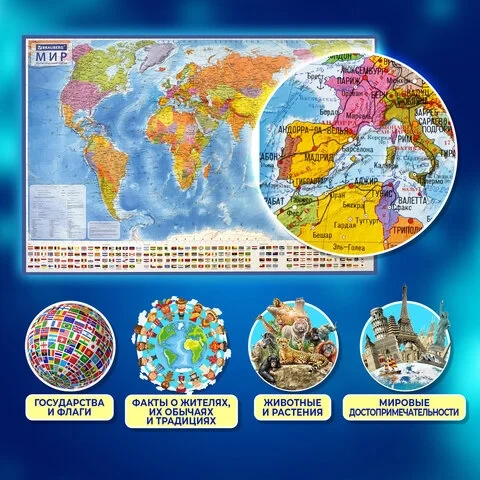 Карта мира политическая 117х80 см, 1:28М, с ламинацией, интерактивная, европодвес, BRAUBERG, 112384