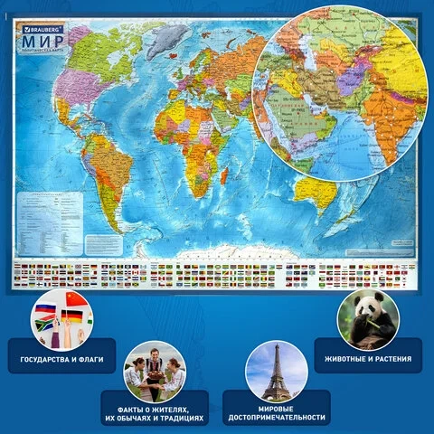 Карта мира политическая 157х107 см, 1:21,5М, с ламинацией, интерактивная, в тубусе, BRAUBERG, 112390