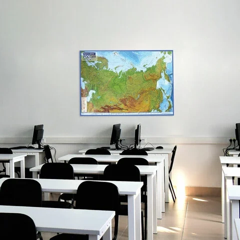 Настенная карта России с масштабом 1:7 500 000 обладает размером 116х80 см. Выполнена из ламинированной бумаги плотностью 170 г/м2. Поставляется в упаковке с европодвесом.